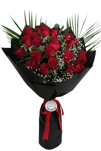 Yıldönümü, Doğum Günü veya sıradan bir günü unutulmaz kılmak için ideal bir seçim olan bu çiçek buketi, zerafetin ve tutkunun simgesi kırmızı güllerle dolu. Siyah buket kağıdı içerisinde sunulan bu zarif sunum, aşkınızı büyüleyici bir şekilde sergilemenizi sağlayacak.
