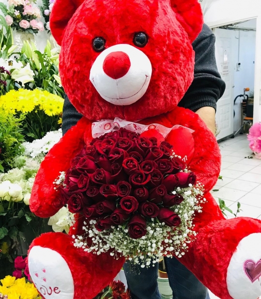 41 Adet Kırmızı Gül ve Kırmızı Peluş Ayı