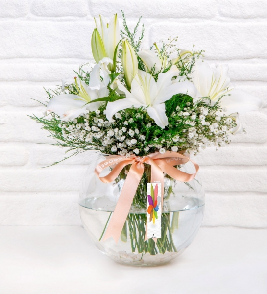 Not: Akvaryum Vazoda Beyaz Lilyum aranjmanı içerisinde yer alan bazı çiçekler, mevsimsel şartları sebebiyle çiçek açmamış halde, kapalı olarak gönderilebilir. Kapalı olan çiçekler 1-2 gün içerisinde, oda sıcaklığında açmaktadır.