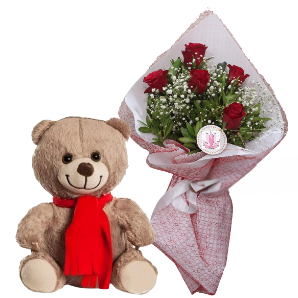 Yanında bulunan 25 cm boyundaki peluş mutlu ayıcık, hediyeye sevimlilik ve sıcaklık katarak hem duygusal hem de görsel olarak etkileyici bir kombinasyon yaratıyor. Bu aranjman, sevgi dolu bir mesaj iletirken aynı zamanda estetik açıdan da göz alıcı bir hediye sunuyor.