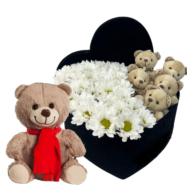 Siyah Kalp Kutu 27x24 cm içerisindeki bu aranjman, zarif bir dokunuşla hazırlanan papatyaların doğallığı ve peluş oyuncakların sevimliliğiyle dikkat çekiyor.