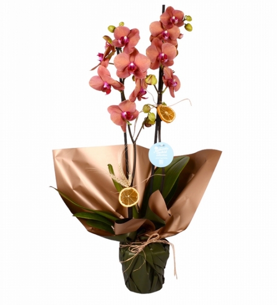 Bu ürünümüzde kaliteli ithal orkide kullanılmıştır. Çiçek yüksekliği yaklaşık 50-60 cm 1 Adet Ateş Rengi Çift Dallı Orkide Ambalaj, Kurdele ve Kurutulmuş Limonlar