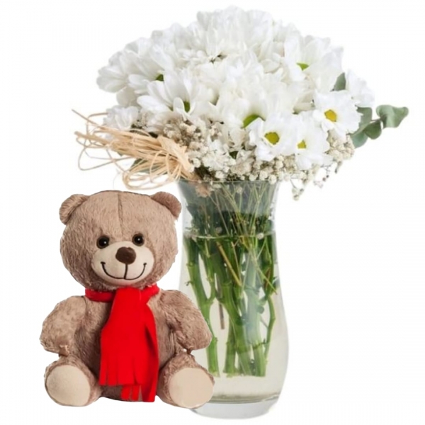 Beyaz papatyaların saflığını ve zarafetini ön plana çıkaran bu özel buket, cipso ve okaliptus yapraklarının doğal dokunuşuyla tamamlanıyor. Silindir cam vazodaki sunumuyla modern ve şık bir görünüm kazanan buket, yanına eklenen mutlu ayıcık ile hediyeye neşe ve sevimli bir sıcaklık katıyor. Hem göz alıcı hem samimi bu kombinasyon, özel günlerde sevdiklerinize unutulmaz bir sürpriz yapmak için ideal bir tercihtir.