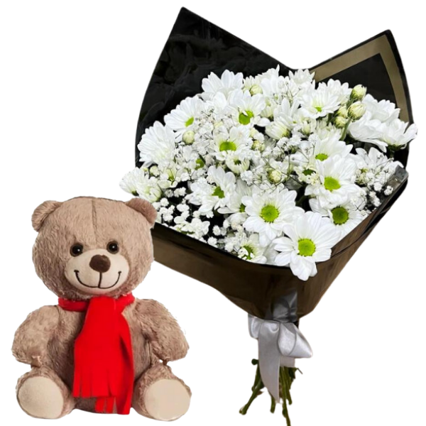 Bu şık buket, siyah buket kağıdıyla özenle tasarlanmış olup, beyaz papatyalarla zarif bir kontrast oluşturur.