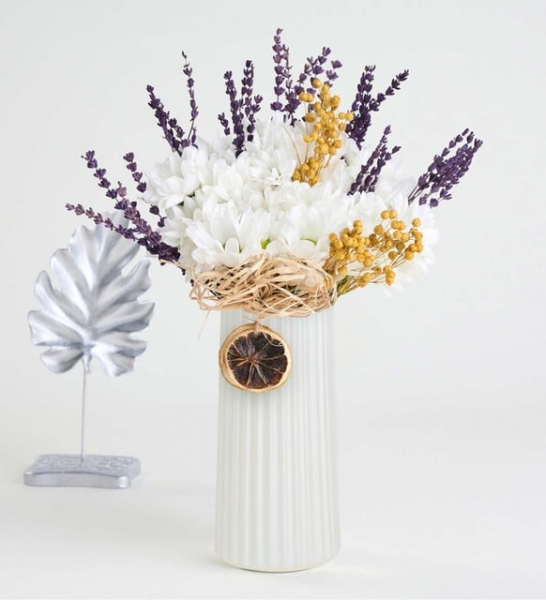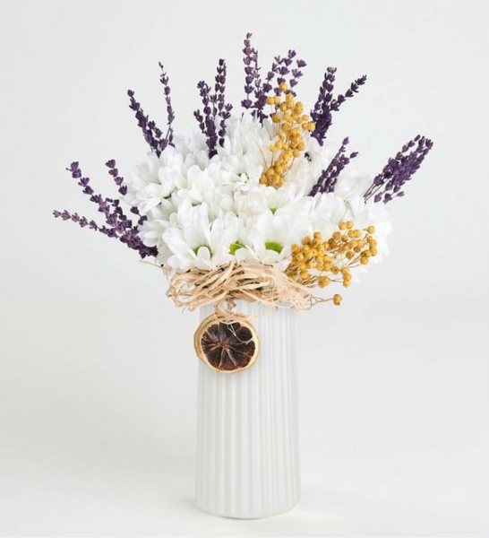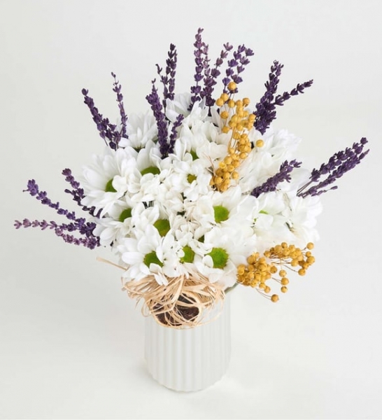 Beyaz papatyaların masumiyetini, lavantaların rahatlatıcı etkisi tamamlıyor! Beyaz Çizgili Vazoda Beyaz Papatyalar ve Lavanta aranjmanı, doğanın tazeleyici etkisiyle evinizi saracak ve sevdiklerinizi mutlu edecek! Beyaz sedefli çizgili polimer vazoda bir araya gelen beyaz papatyalar, tüm göz alıcılığı ile herkesin dikkatini çekiyor. Aranjmanın başrol oyuncusu olan beyaz biçme papatyalar, “Masum sevgi” mesajını taşıyor. Size de, bu özel mesajlı aranjmanı sevdiklerinize hediye etmek kalıyor. Nefes kesen lavantalar, burlap ip, rafya, kurutulmuş limon ve sarı luna çiçekleri ile süslenen bu özel aranjman, modern ve minimal bir dokunuşla yaşam alanlarının havasını bir anda değiştiriyor. Bu özel aranjman ile, sevginizi ve takdirinizi dile getirmenin bir adım ötesine geçebilir ve sevdiklerinizin yüzünü gülümsetebilirsiniz. Vazonun şık tasarımı ile birleşen beyaz biçme papatyalar, görenleri kendine hayran bırakıyor. Beyaz Çizgili Vazoda Beyaz Papatyalar ve Lavanta aranjmanını, özel bir günde veya sıradan bir anı özelleştirmek için tercih edebilirsiniz. Siparişiniz sonrasında açılacak “Not oluşturma” sayfasında birkaç içten cümle ekleyerek, hediyenizi çok daha özel ve anlamlı hale getirmeyi unutmayın.
