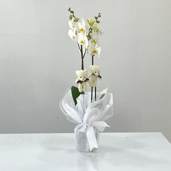 Beyazlar içinde tasarlanmış 2 dallı beyaz orkide ve 8-10 cm boylarında fiyonk peluş ayıcıklı anahtar ile haırlanmış zerafet dolu aranjmanımız sizler için özel olarak hazırlandı...