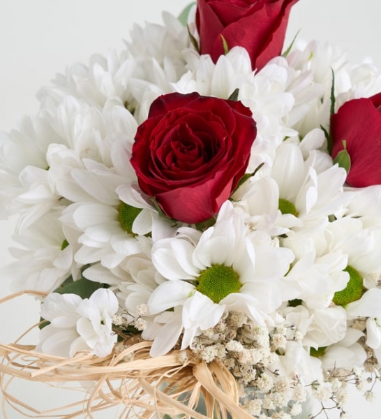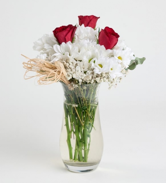 Paşabahçe vazo içerisinde beyaz papatyalar ve kırmızı güllerden oluşan derlemedir. Ürün Yüksekliği: 35-40 cm Diyarbakır çiçekçi adresleri