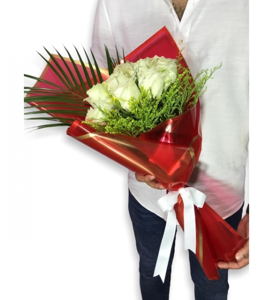 Saflığın ve masumiyetin sembolü Beyaz Güller şık bir bukette sevdiklerinizi mutlu etmeniz için hazırlandı.