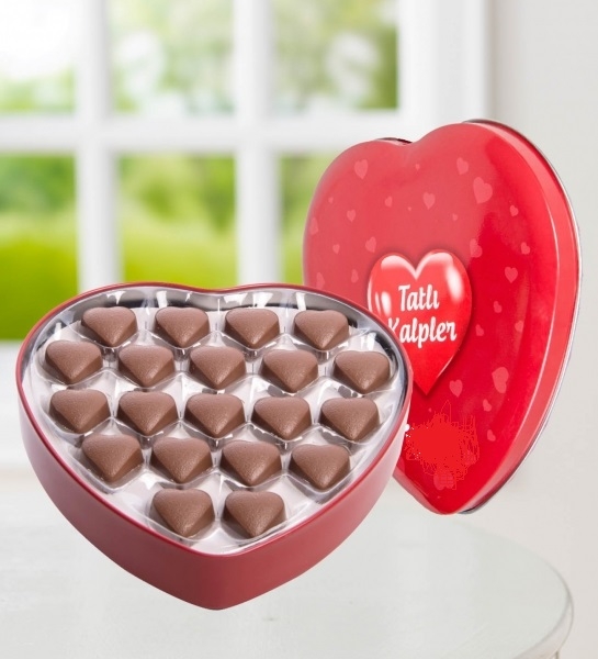Kutu İçeriği: Özel tasarım metal kutu içinde net 200 gram 20 adet özel fındık kremalı, ekstra sütlü kalp çikolata.