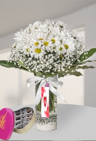 ask sembolu sembollü tasıyan Papatya Ve Special Çikolata ürünü sevgiyi anlatmanın en degerli yolu *1 Demet Beyaz Paptaya * Cam Vazo *Special Çikolata *cipso ve yeşiliklerden oluşuyor