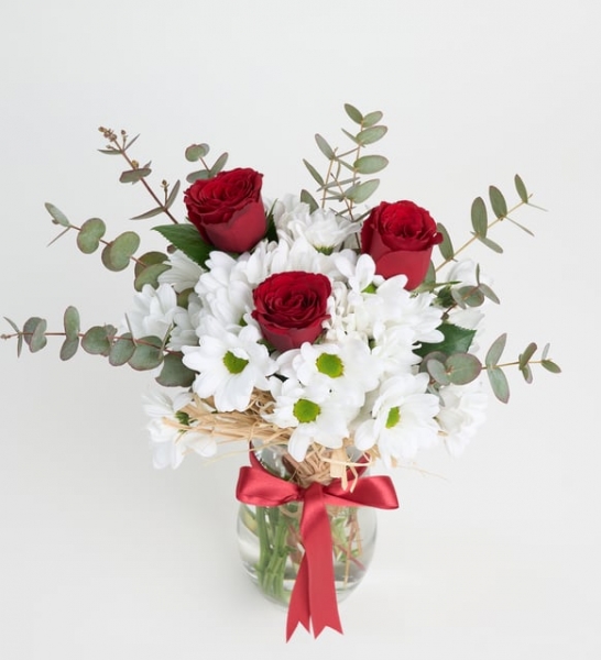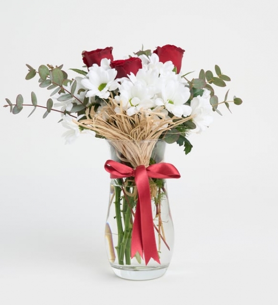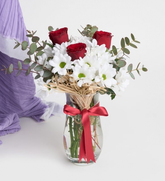 Ürün İsmi: Cam Vazoda 3 Kırmızı Gül ve Beyaz Papatyalar