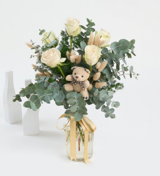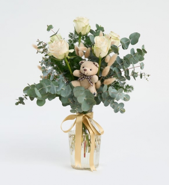 Ürün İsmi: Cam Vazoda Beyaz Güller ve Ayıcık Anahtarlık