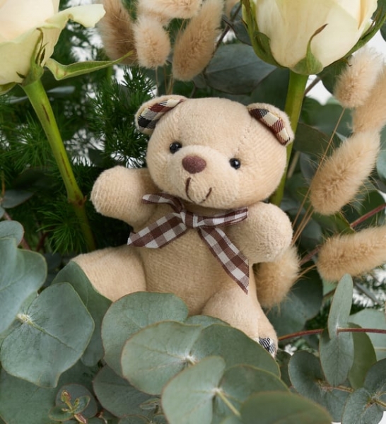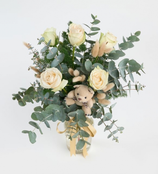 Beyaz güllerin cazibesine ve duruluğuna kendinizi teslim etmeye hazır olun… Cam Vazoda Beyaz Güller ve Ayıcık Anahtarlık hediye seti, şimdi sepetinize eklemeniz için sizi bekliyor! Aranjmanın başrolünde, her biri özenle seçilen 5 adet ithal beyaz gül yer alıyor. Bu güller, sevgiyi ve masumiyeti simgeliyor. Okaliptusun ve mirkeladusun ferahlatıcı dokunuşu, bej lagurusun doğal güzelliğiyle taçlanıyor. Sarı yaldızlı kurdele ile süslenen şık cam sürahi vazo içerisinde sergilenen muhteşem aranjman, yalnızca özel günlerde değil, sıradan anları unutulmaz kılmak için de mükemmel bir tercih oluyor. Bu özel aranjmana, tüm sevimliliği ile ayıcık anahtarlık eşlik ediyor. Size de bu aranjmanı sevdiklerinize hediye etmek kalıyor. Dilerseniz sevdikleriniz için özel olan bir günde, dilerseniz sadece onları mutlu etmek istediğiniz sıradan bir günde, siz de bu özel hediyeyi tercih edebilirsiniz. Siparişiniz sonrasında çıkacak “Not oluşturma” sayfasında birkaç cümlelik not oluşturarak hediyenizi daha anlamlı bir hale getirmeyi unutmayın.