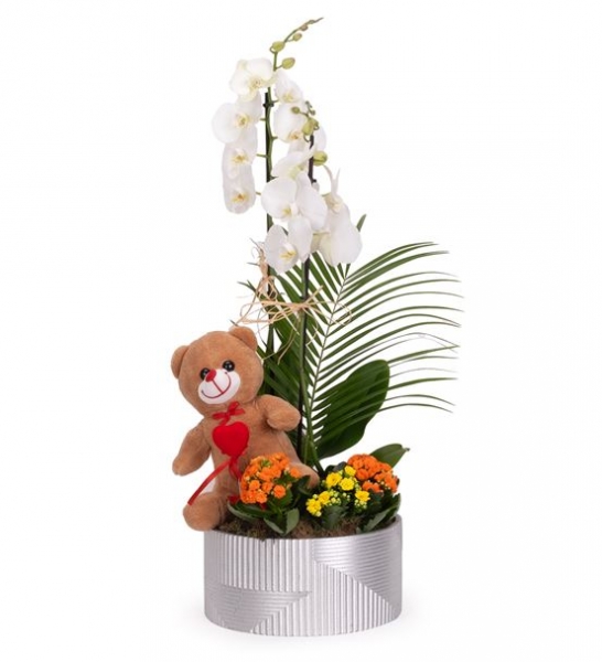 Gümüş renk saksı içerisinde 2 dal beyaz saksı orkide, renkli kalanchoe çiçekleri ile peluş ayıcığı birleştirdik ve size özel tasarım haline getirdik. İster özür dilerim, ister içimden geldi, ister sebepsizce bir mesaj ile sevdiklerinizi hemen mutlu edin.