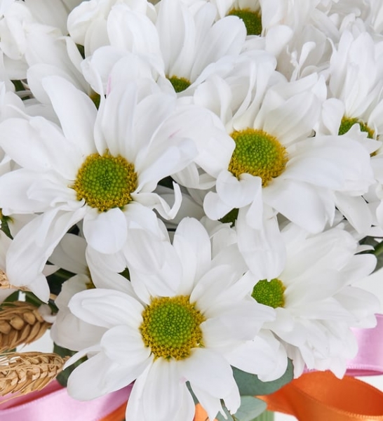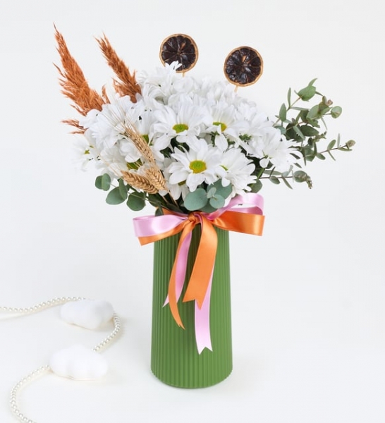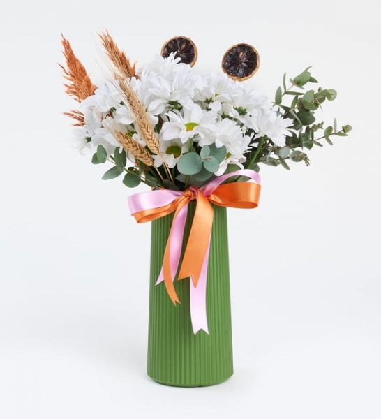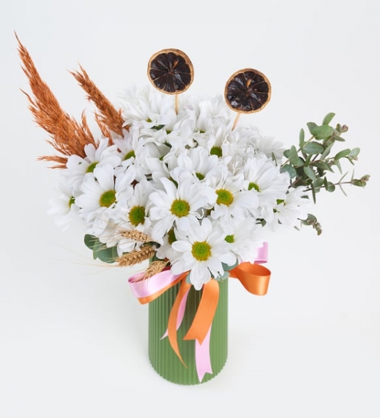 Papatyalar bir yana, sevdiklerinizi mutlu etmek diğer yana… Şimdi onları doğanın en güzel çiçekleri ile mutlu edin ve Çift Renk Kurdeleli Yeşil Vazoda Beyaz Papatyalar aranjmanını sepetinize ekleyin! Yeşil çizgili polimer vazo içerisinde bir araya gelen beyaz biçme papatyalar, en masum duyguları ifade ediyor. Göz alıcı turuncu kurdele ve açık pembe kurdele detayı, aranjmana sofistike bir dokunuş katıyor. Pampas otu, ferahlatıcı okaliptus dalları ve doğallığı vurgulayan başak buğdaylar ise, aranjmanı tamamlıyor. Kurutulmuş limon detayı da, herkese hitap ediyor. Böylece sevdiklerinize benzersiz bir sürpriz yapma şansı sizin oluyor! Size de bu özel hediyeyi sevdiklerinize hediye etmek kalıyor! Sevdiklerinize olan hislerinizi dile getirmenin zarif yolu olan bu aranjmanı; doğum günleri, yıl dönümleri veya sadece içten bir teşekkür için gönül rahatlığıyla tercih edebilirsiniz. Siparişiniz sonrasında çıkacak “Not oluşturma” sayfasında birkaç cümlelik not oluşturarak hediyenizi daha anlamlı bir hale getirmeyi unutmayın.