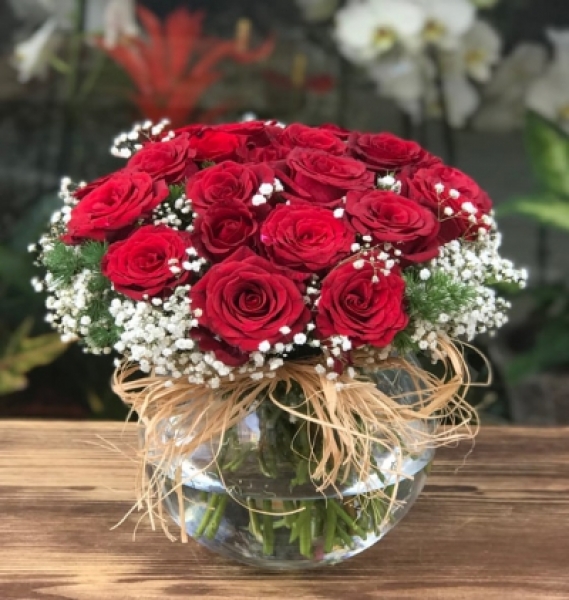 Akvaryum fanusta cipsofilyalar ile dizayn edilen 21 adet kırmızı gül