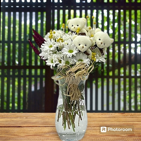 Silindir cam vazoda beyaz papatyalar, sarı luna ve sap bağlama ile tanzim edilerek ile hazırlanmış ve 3 adet Fiyonklu Peluş Ayıcık Anahtarlık Krem 8-10 cm ile süslenmiş aranjmanımız, zarif ve sevimli bir hediye önerisi olarak sizler için tasarlandı...