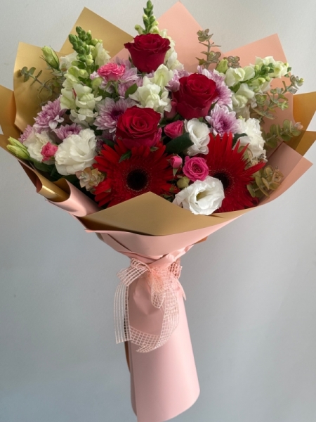 Yaklaşık 65 cm yüksekliğinde buket, kırmızı gül, gerberalar, papatyalar ve mevsimin en taze çiçekleri ile hazırlanmaktadır.