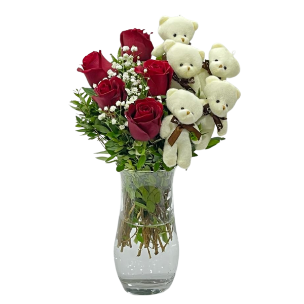 Silindir cam vazoda 5 kırmızı gül ,5 Fiyonk Peluş Ayıcık Anahtarlık ,cipso ile tasarladığımız çiçek aranjmanımız sizler için hazırlandı...