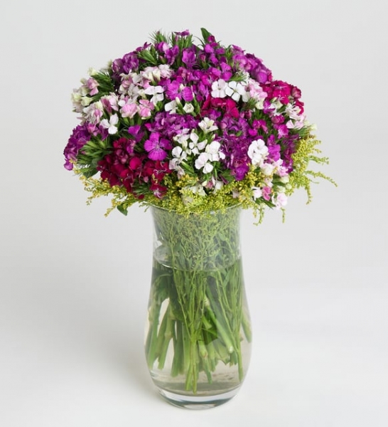 Bakım Önerisi:Çiçek buketinizi/vazonuzu eve getirdiğinizde, ambalajını açıp varsa iplerini çözün. Çiçeklerin daha fazla su çekebilmesi için alt yaprakları temizleyin ve saplarını 3-5 cm kadar, suyun altında tutarak kesin. Çiçekleri yerleştireceğiniz vazoyu iyice temizleyin ve vazoya oda sıcaklığında su doldurun; su seviyesini sapların yarısına kadar gelecek şekilde ayarlamaya dikkat edin. Vazonuza bir paket çiçek besini eklemeyi unutmayın. Çiçeklerinizi direkt güneş ışığından, rüzgardan ve ısı kaynaklarından (radyatör, klima, soba gibi) uzak tutun. Su seviyesini her gün kontrol ederek değiştirin ve her su değişiminde sapları 0.5-1 cm kadar tekrar kesin. Ayrıca, suyu klorsuz ve dinlenmiş su ile değiştirmek çiçeklerinizin ömrünü uzatmanızı sağlayacaktır. Solan veya kuruyan çiçekleri temizleyerek diğer çiçeklerin daha uzun süre taze kalmasını sağlayabilirsiniz.