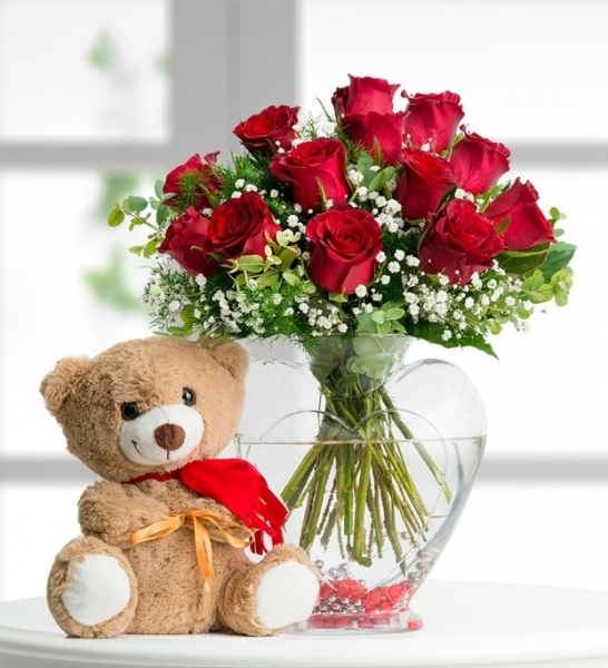Kalp Vazo 13 Gül ve Sevimli Ayıcık Peluş Ayıcık Kalp Vazoda 13 Adet Kırmızı Gül İle Tanzim Edilmiş Aranjman