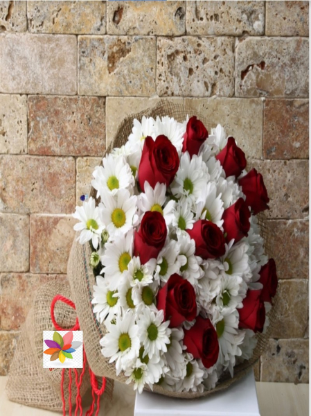 Dolu Dolu Beyaz Papatya Ve 11 Adet Upper Class Kırmızı Güller İle Taçlandırlan , Üstün Kalite Malzemeler İle Buket Haline Getirilmiş Premium Butik Çiçek Buketi çiçeksepeti sur diyarbakır