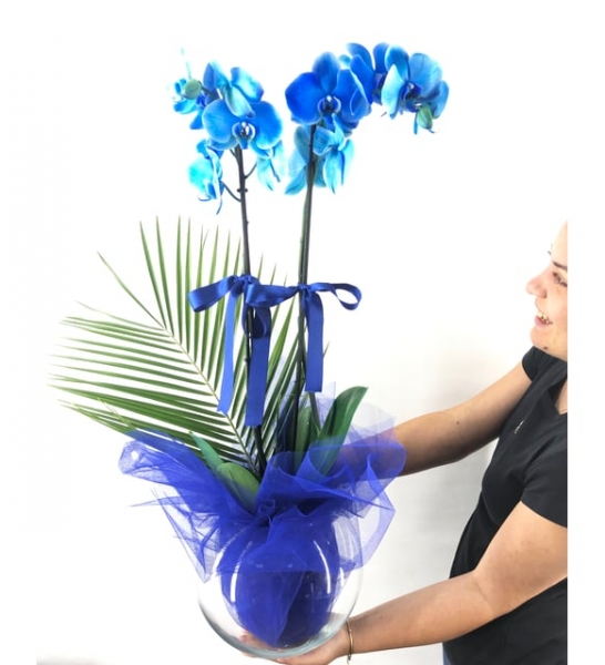 Cam saksı ölçüleri: 17x17 cm Yaklaşık Toplam Yükseklik: 70 cm Paşabahçe cam saksı içerisinde 2 dal mavi orkide kullandık. Bakımı hakkında: Orkideler köklerinde su depolayan bitkilerdir. Bu yüzden haftada iki kez püskürtme yöntemiyle su verilmesi ya da köklerinin suyun altında tutulması kafidir. Ayrıca orkideler ışığı ve gece esintisini sever. Yaz aylarında özellikle geceleri açık bir pencere önünde tutulması çiçeklenme oranını arttırır. Çiçekleri tamamen döküldüğünde bir sonraki çiçeklenme dönemine kadar serin bir ortamda muhafaza edilmesi kafidir.