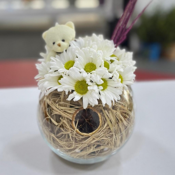 Akvaryum cam vazo içerisinde beyaz papatyalar ile hazırladığımız ve 8-10 cm krem renkli fiyonklu peluş ayıcık anahtarlık ile bütünleştirerek sizler ve sevdikleriniz için daha anlamlı kıldığımız aranjmanımız sizler için tasarlandı...
