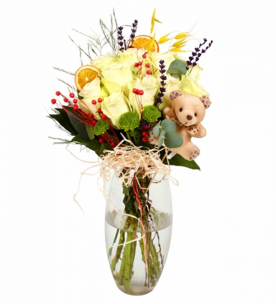 Bu vazo ürünümüzde kaliteli güller kullanılmaktadır. Çiçek yüksekliği yaklaşık 40-50 cm 11 Adet Beyaz Gül 3 Adet Yeşil Krizantem Dekoratif Silindir Cam Vazo Kurutulmuş Limonlar ve Mini Ayıcık Kuru Çiçekler ve Yeşillikler