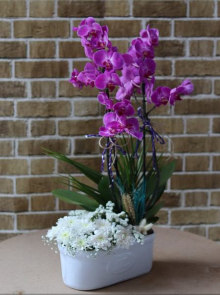 Özel Balkon Hisar Seramik Vazo İçinde Çift Dal Mor Orkide Ve Beyaz Canlı Papatyalardan Oluşan Şık Aranjman