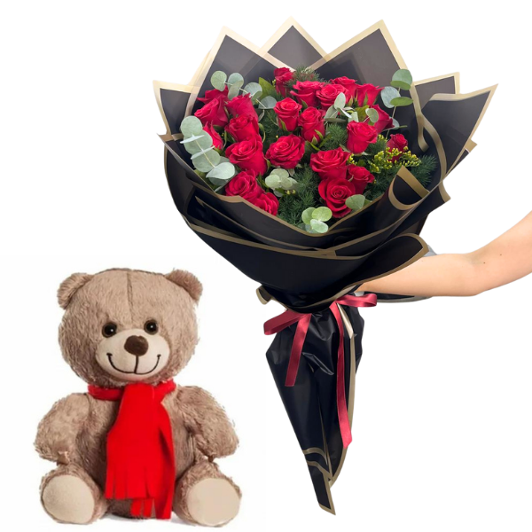 Bu özel kombinasyon, hem zarafeti hem de sevimliliği bir araya getirerek, unutulmaz bir hediye sunuyor. Siyah buket kağıdının sofistike havası, güllerin tutkusu ve ayıcığın masum sevimliliğiyle dengelenerek, bu hediye hem romantik hem de duygusal bir anlam kazanıyor.
