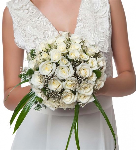 Çiçek süngeri üzerine 50 Beyaz Gülden yuvarlak şeklinde işlenmiş çiçekler, cipsofilyalar ve ince yeşilliklerle size özel gelin buketi tasarladık.