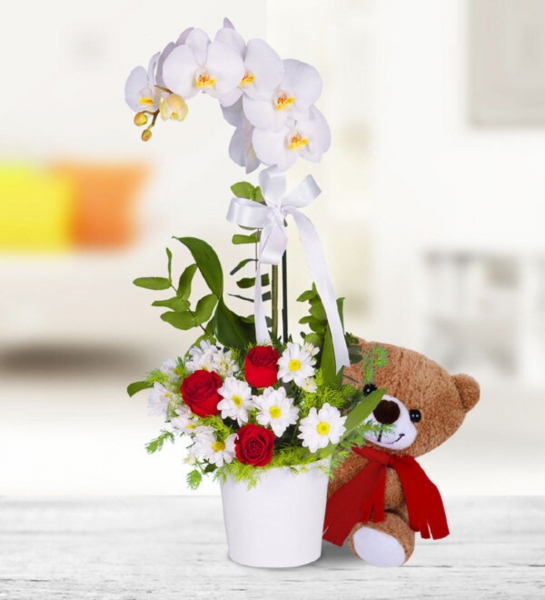 Görkemi ve güzelliğiyle büyüleyen, zarafetiyle tüm bakışları üzerine çeviren beyaz orkide şimdi kırmızı gül ve beyaz papatyalarla tüm güzelliğini sevdiklerinize sunmaya geliyor. Not; Papatyaların yapısı gereği aranjmandaki çiçek adedine tomurcuklar da dahildir.