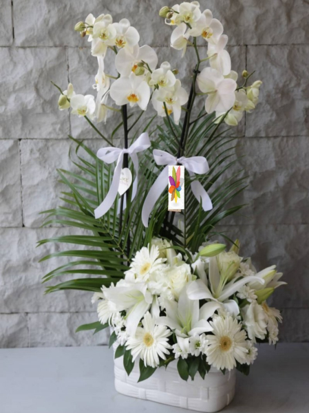 Özel Seramik Vazo İçinde, stok durumuna göre( beyaz yada siyah )renk gönderilir. XXL Çift Dal Beyaz Orkide , Lilyum Ve Beyaz Güller Kullanılarak Yapılan Gösterişli Büyük Aranjman.