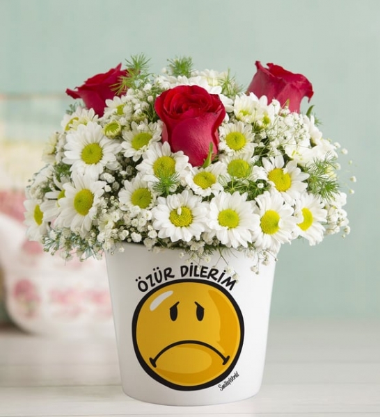 Sevdiklerinizin kalbini yeniden kazanın. Özür Dilerim temalı vazo içerisinde papatyalar ve güller ile hazırlanan bu özel aranjman, sevdikleriniz için samimi bir özür olacak.