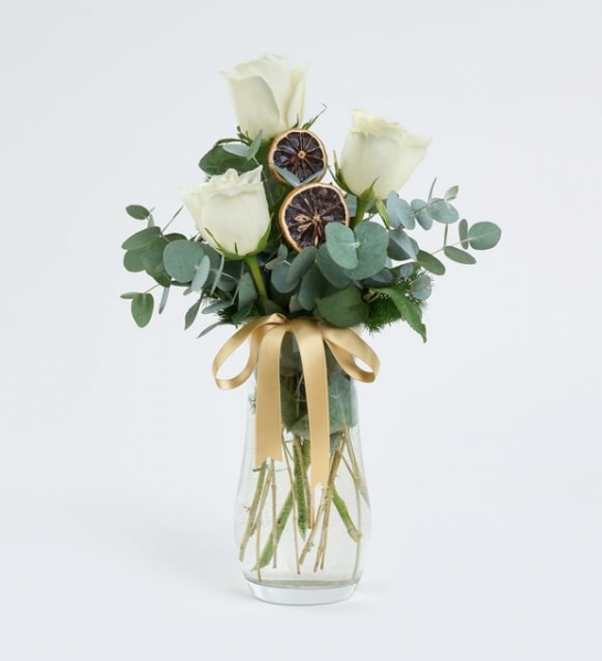Hayatın zarafetini ve sadeliğini yansıtan beyaz güller, masumiyetin ve saf duyguların en güçlü anlatıcılarıdır. Beyaz güller, her anınızı güzelleştirmek ve sevdiklerinize unutulmaz bir jest yapmak için eşsiz bir seçenektir. Özel olarak tasarlanan Paşabahçe Kristal Cam Vazoda 3 Beyaz Gül, cipso, okaliptus, kurutulmuş limon ve mirkeladus ile zarif bir bütünlük oluşturuyor. Her biri özenle seçilmiş bu çiçekler, saf ve huzur dolu bir atmosfer yaratmak için tasarlandı. Bu şık aranjmanı, sevdiklerinize minnettarlığınızı ifade etmek, özel anları taçlandırmak ya da sıradan bir günü özel kılmak için hediye edebilirsiniz. Özel tasarım Paşabahçe kristal silindir vazosu, aranjmanı hem görsel hem de işlevsel açıdan tamamlar. Bu zarif çiçek aranjmanıyla sevdiğiniz kişiye, "Seninle hayat daha güzel" mesajını iletebilirsiniz. Siparişiniz sonrasında çıkacak “Not oluşturma” sayfasında birkaç cümlelik not oluşturarak hediyenizi daha anlamlı bir hale getirmeyi unutmayın.