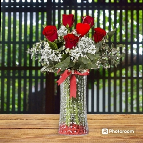 Kelimeleriniz aşkınızı anlatmaya yetmiyorsa, büyük aşkın simgesi, cam vazoda beyaz cipsolarla süslenmiş kırmızı güller sizin yerinize konuşacak.