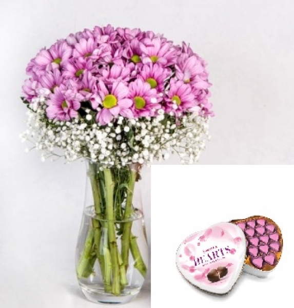 Pembe Papatya : 45 Adet Paşabahçe Vazoda Pembe Papatya ve Kalpli Çikolata Kutu İçeriği: Özel tasarım metal kutu içinde net 200 gram 20 adet özel fındık kremalı, ekstra sütlü kalp çikolata.