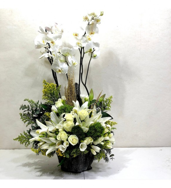Özel Saksı içerisinde 3 dal beyaz renk orkide, 15 adet beyaz Gül sarı cibso kuru dallar ve beyaz lilyum bulunmaktadır. Orkide Aydınlık bir ortamda bulunmalıdır. Klimalı yerlerden uzak durmalıdır. Ev ve İş ortamınıza doğallık ve şıklık katacak bir tasarımdır. Orkide yaklaşık 60cm`dir. saksı uzunluğu 25x10 cm`dir.Not Beyaz Lilyum Tazelik Durumuna Göre Kapalı Gönderim Sağlanabilir .
