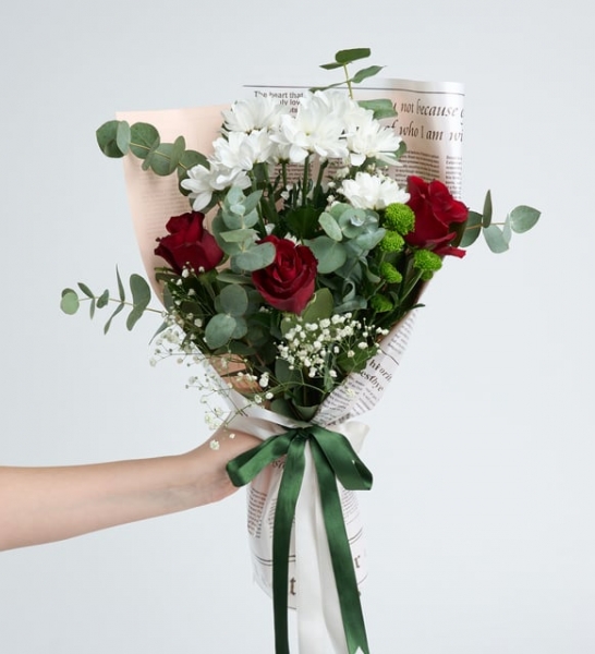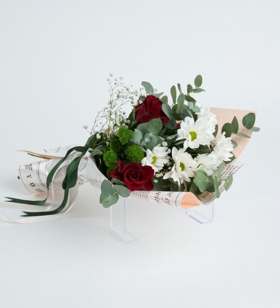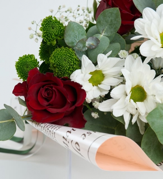 Ürün İsmi: Pembe Gazete Bukette Kırmızı Güller ve Papatyalar