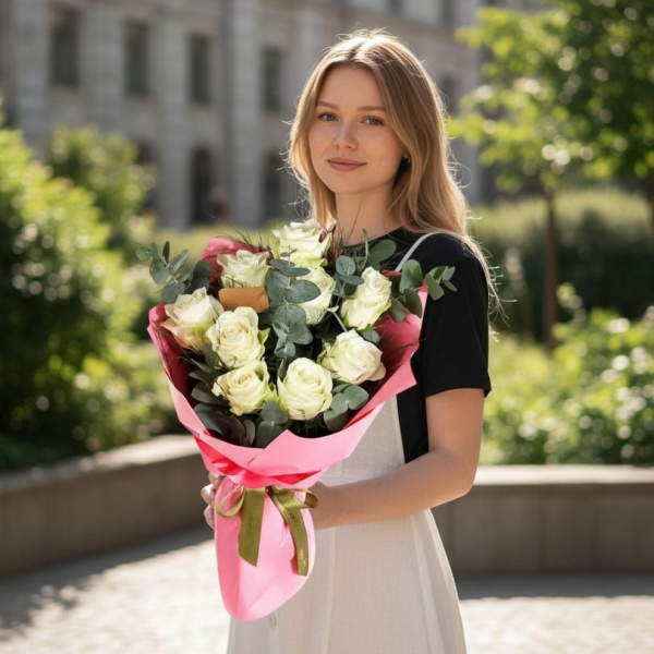 Pembe kağıda sarılmış 9 beyaz gül, zarif ve romantik bir görünüm sunuyor. Sevdiklerinize özel bir hediye.