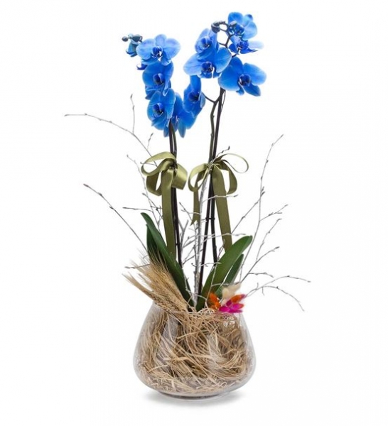 Yaklaşık 70 cm olan tek köklü Pure Serisi İki Dal Mavi Orkide’yi, cam fanus içerisine koyup ahşap parçaları ve phoenix yaprağı ile süsledik. NOT: Phoenix yaprağı kesme bir bitki olup sadece görsel amaçlı kullanılmıştır. Zaman içerisinde sedece Phoenix yaprağında kuruma meydana gelir. Pure Serisi İki Dal Mavi Orkide Hakkında Bilmen Gerekenler; Phalaenopsis orkideler, yaklaşık olarak 60 tür cinsi olan salepgiller familyasından bir orkide cinsidir ve günümüzde çoğu insan tarafından sevilen tropikal orkideler arasındadır.NOT: Doğada mavi renk orkide bulunmamaktadır. Özel bir yöntem ile çiçekler boyanmıştır. Çiçekler belli bir süre sonra beyaz renge dönüşecektir. Pure Serisi İki Dal Mavi Orkide’ye Nasıl Bakmalısın? Orkide’yi ışık alan yerlere koymalısın. Orkideler köklerinde su depolayabildikleri için su vermek yerine yapraklarına su püskürtmen daha sağlıklı olacaktır. Çiçeklerin tamamı döküldüğünde 14° C sıcaklıkta muhafaza ederek yeniden çiçeklenme dönemine girmesini sağlayabilirsin.