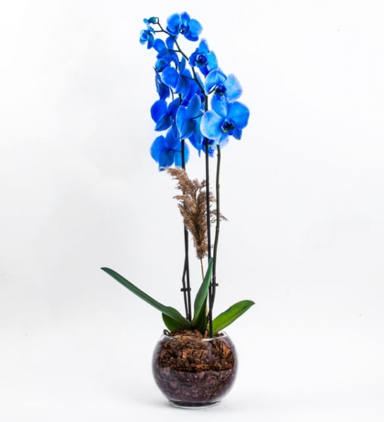 Yaklaşık 70 cm olan tek köklü Pure Serisi İki Dal Mavi Orkide’yi, cam fanus içerisine koyup ahşap parçaları ve phoenix yaprağı ile süsledik. NOT: Phoenix yaprağı kesme bir bitki olup sadece görsel amaçlı kullanılmıştır. Zaman içerisinde sedece Phoenix yaprağında kuruma meydana gelir. Pure Serisi İki Dal Mavi Orkide Hakkında Bilmen Gerekenler; Phalaenopsis orkideler, yaklaşık olarak 60 tür cinsi olan salepgiller familyasından bir orkide cinsidir ve günümüzde çoğu insan tarafından sevilen tropikal orkideler arasındadır.NOT: Doğada mavi renk orkide bulunmamaktadır. Özel bir yöntem ile çiçekler boyanmıştır. Çiçekler belli bir süre sonra beyaz renge dönüşecektir. Pure Serisi İki Dal Mavi Orkide’ye Nasıl Bakmalısın? Orkide’yi ışık alan yerlere koymalısın. Orkideler köklerinde su depolayabildikleri için su vermek yerine yapraklarına su püskürtmen daha sağlıklı olacaktır. Çiçeklerin tamamı döküldüğünde 14° C sıcaklıkta muhafaza ederek yeniden çiçeklenme dönemine girmesini sağlayabilirsin.
