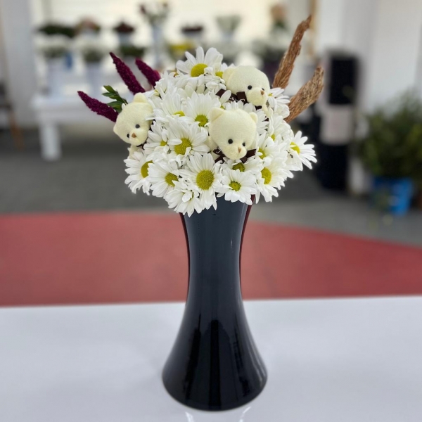 Sevgililer ve Romantik İlişkiler: Siyah vazo, beyaz papatya ve sevimli fiyonklu maskot ayıcıklar, romantik bir atmosfer yaratmak için mükemmel bir kombinasyon olabilir. Bu aranjman, sevgiliniz veya eşiniz için romantik bir hediye seçeneği olabilir.