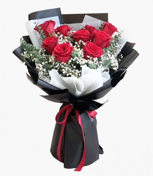 Cipsofilya ve yeşlliklerle süslenmiş, siyah/beyaz puantiyeli kağıda sarılı 9 Kırmızı Gül Buket ile sevdiklerinize sürpriz yapabilirsiniz.