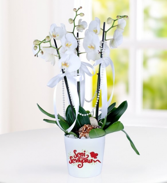 Saksı Phalanopsis Beyaz üçlü : 1 Adet Sevginizi dile getirmenin en özel ve anlamlı yolu. Seni Seviyorum temalı saksısı ile üçlü dal beyaz orkide, O`nun kalbini yeniden fethedecek.