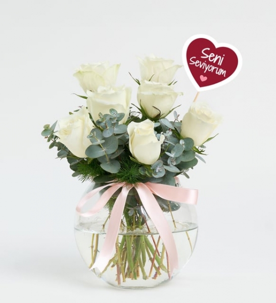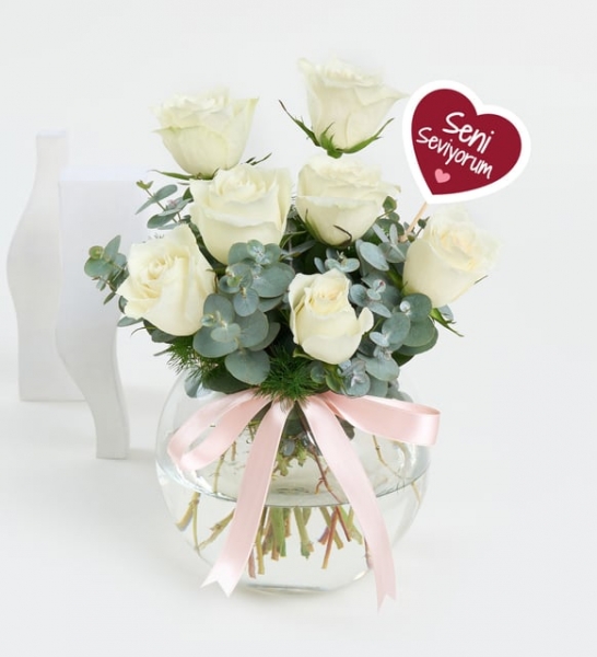Ürün İsmi: Seni Seviyorum Pankartlı Cam Akvaryumda 7 Beyaz Gül