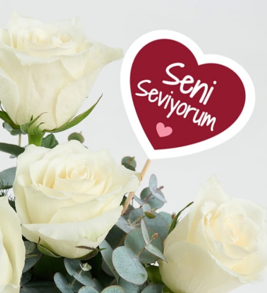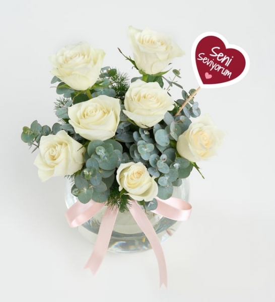 Tarih boyunca yüzlerce farklı dilde söylenen ama anlamı herkes için aynı olan tek bir cümle var: “Seni seviyorum…” Şimdi bu özel cümleyi, Seni Seviyorum Pankartlı Cam Akvaryumda 7 Beyaz Gül aranjmanı ile sizin için en özel kişiye söyleme zamanı! Beyaz güllerin tüm masumiyetini ve asaletini taşıyan bu özel aranjman, cam akvaryum içerisindeki şık tasarımıyla oldukça şık bir hediye alternatifi sunuyor. “Seni Seviyorum” pankartı ile tamamlanan zarif çiçek düzenlemesi, sevdiklerinize verdiğiniz değeri ve duyduğunuz mutluluğu ifade etmenin en güzel yollarından biri oluyor. Aranjmanda kullanılan 7 adet beyaz gül, mirkeladus ve okaliptus yapraklarıyla doğal bir görünüm kazanırken, açık pembe kurdele ile süslenen cam akvaryum, bu şık tasarımı tamamlıyor. Sevdiklerinizin gününe anlam katmak, özel bir anı unutulmaz kılmak veya sıradan bir günü daha özel hale getirmek için bu eşsiz çiçek aranjmanını sipariş edebilirsiniz. Siparişiniz sonrasında çıkacak “Not oluşturma” sayfasında birkaç cümlelik not oluşturarak hediyenizi daha anlamlı bir hale getirmeyi unutmayın.