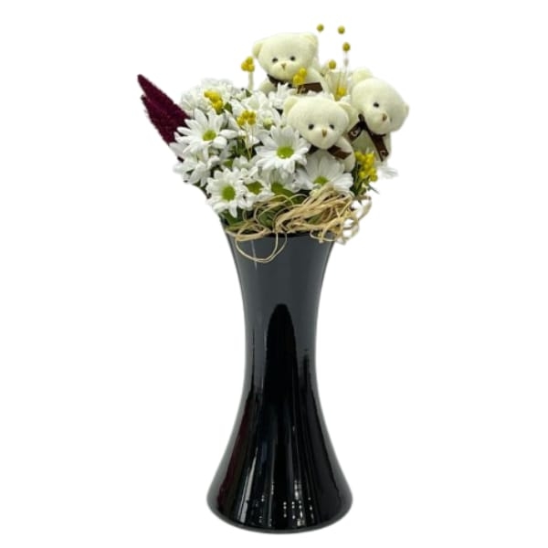 Siyah kalipso vazoda beyaz papatya ve 8-10 cm boyutlarında fiyonk peluş ayıcık anahtarlıktan oluşan sarı luna,mor setteria ve sap bağlama ile görsel şölen oluşturduğumuz Sevgi Dolu Beyaz Papatyam aranjmanımız sizler ve sevdikleriniz için özel olarak tasarlandı...