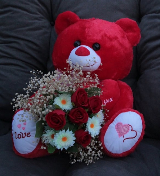Sevgiliye Sevimli Kırmızı Ayıcık Kaliteli 50 cm Gül & Papatya Cipsolarla Sarılı Buket